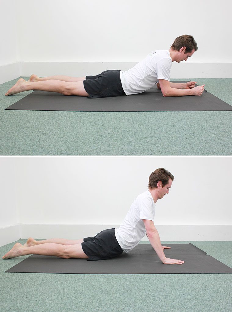 Prone lying extension work (similar to the ‘cobra’ position in Yoga) is perhaps the best way to undo a sustained period of sitting. Lie flat on your front and relax for 1-2 mins before rising up onto your elbows and holding up there for 2-3 mins then returning to lie flat. Progress that further by pressing all the way up into full extension (using your arms not your back), hold the top for 2 seconds and return – you can repeat the full extension 10 times or so.