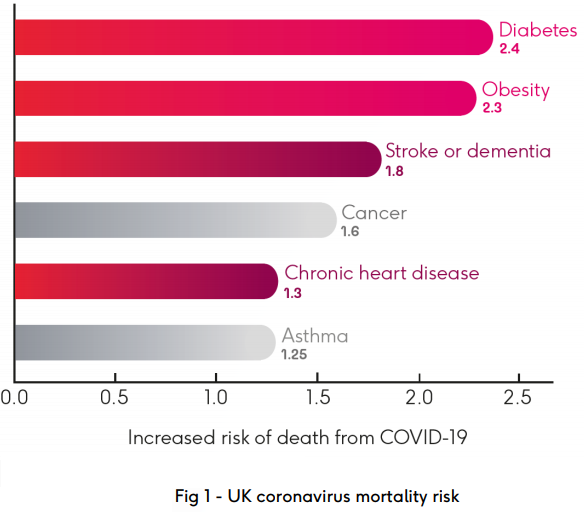 The British Heart Foundation have created a chart showing the increased risk of death from coronavirus based on pre-existing underlying conditions below; with Coronary heart disease (CHD) being one of the most common pre-existing conditions for deaths involving coronavirus.
