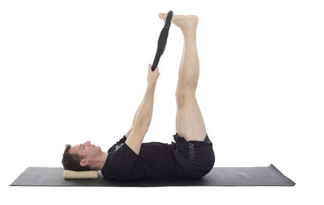 3. Roll back until your head reaches the folded towel, your arms should be facing straight up towards the ceiling. Inhale and roll back up to sitting. If you get stuck at any stage, drop the arms with the ring a little lower.