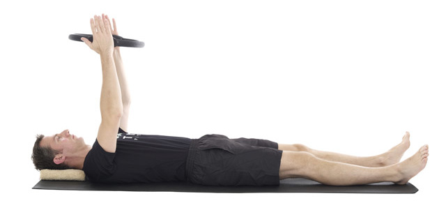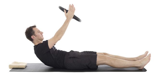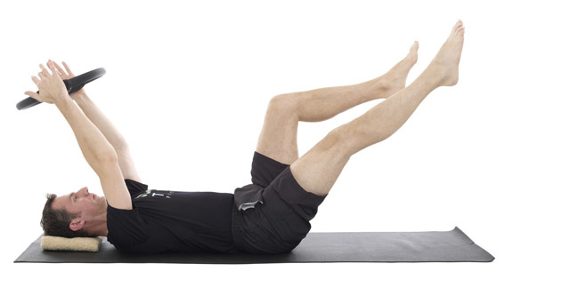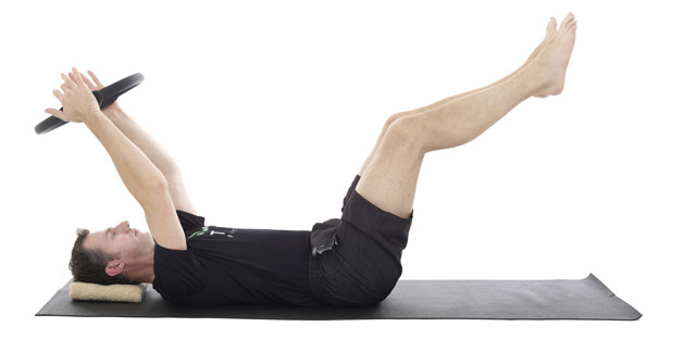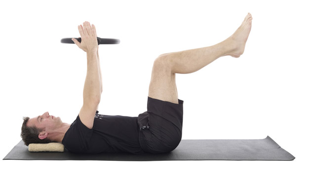 1. Lie on your back with a small folded towel under your head, the ring held above your chest like steering wheel and your legs in tabletop.