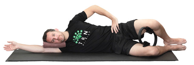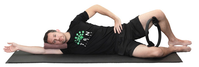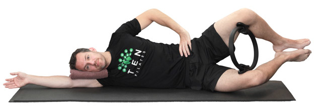 1. Lie on your side with the lower arm extended away in line with the body and a small folded towel between your arm and head, top hand resting on your hip. Knees are bent with the ring between them and your heels in line with your buttocks. Engage your deep abdominals and lift the lower waist away from the floor.