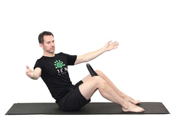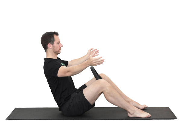 1. Sit up tall with the ring between your knees. Your arms are out to your sides and slightly ahead of your shoulders, as if you were about to hug a giant tree. Exhale, squeeze on the ring and hinge back from the hips with the chest proud. Do not allow the lower back to round.