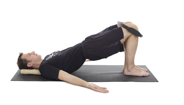 1. Lie on your back with a small folded towel under your head, heels towards your buttocks and the ring placed on top of your knees. Exhale, push your knees out against the ring and draw your hip bones towards your rib cage.
